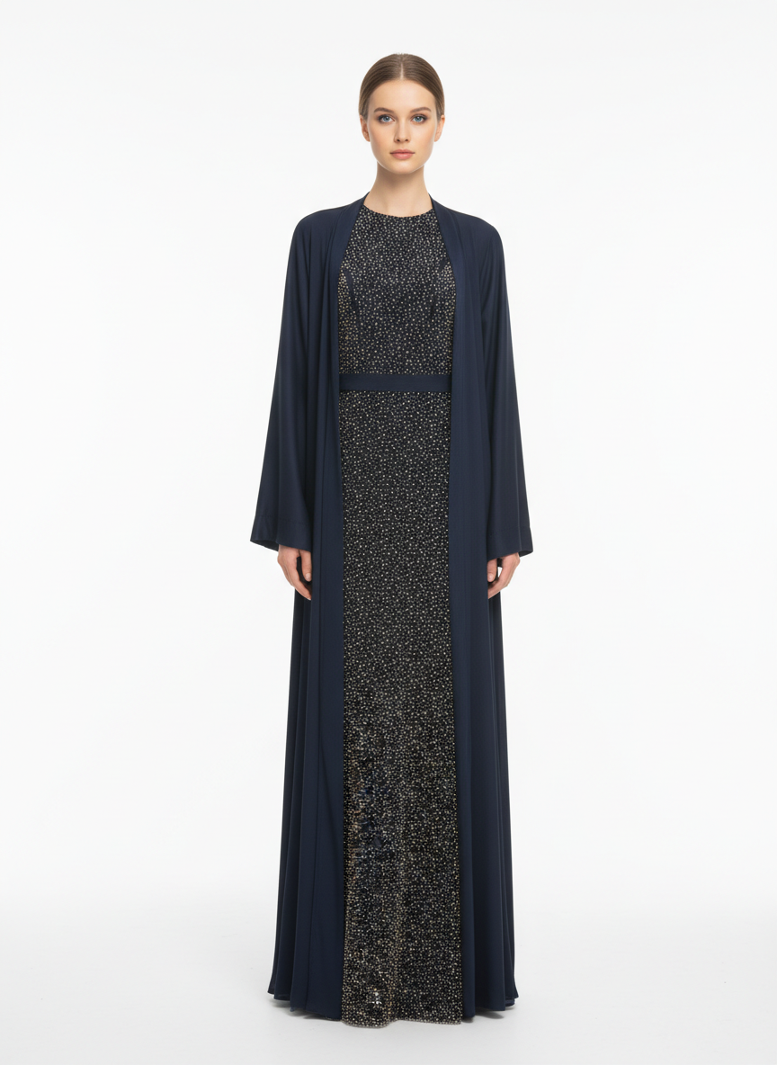 Celestial Blue Abaya Set features a sophisticated design in a deep blue shade, offering timeless modest elegance. Ideal for women seeking luxury abayas in Dubai and stylish modest fashion in the UAE.